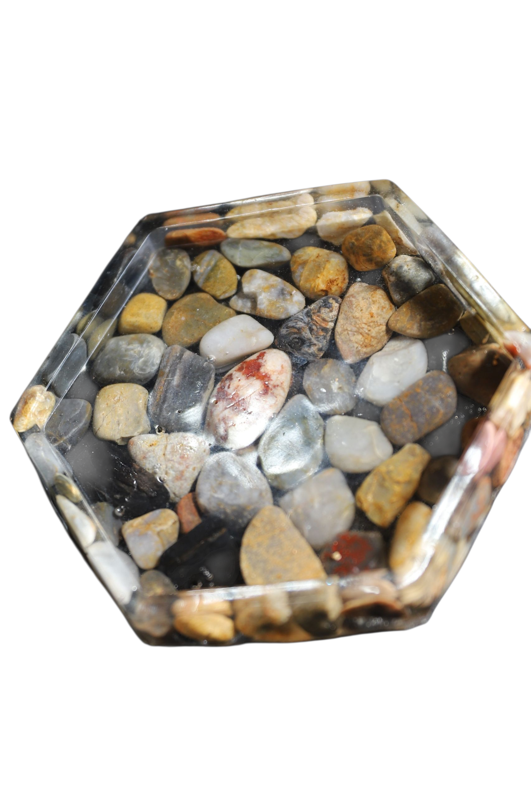 Hexagon Resin Gemstone Coaster – Embedded Natural River Stones